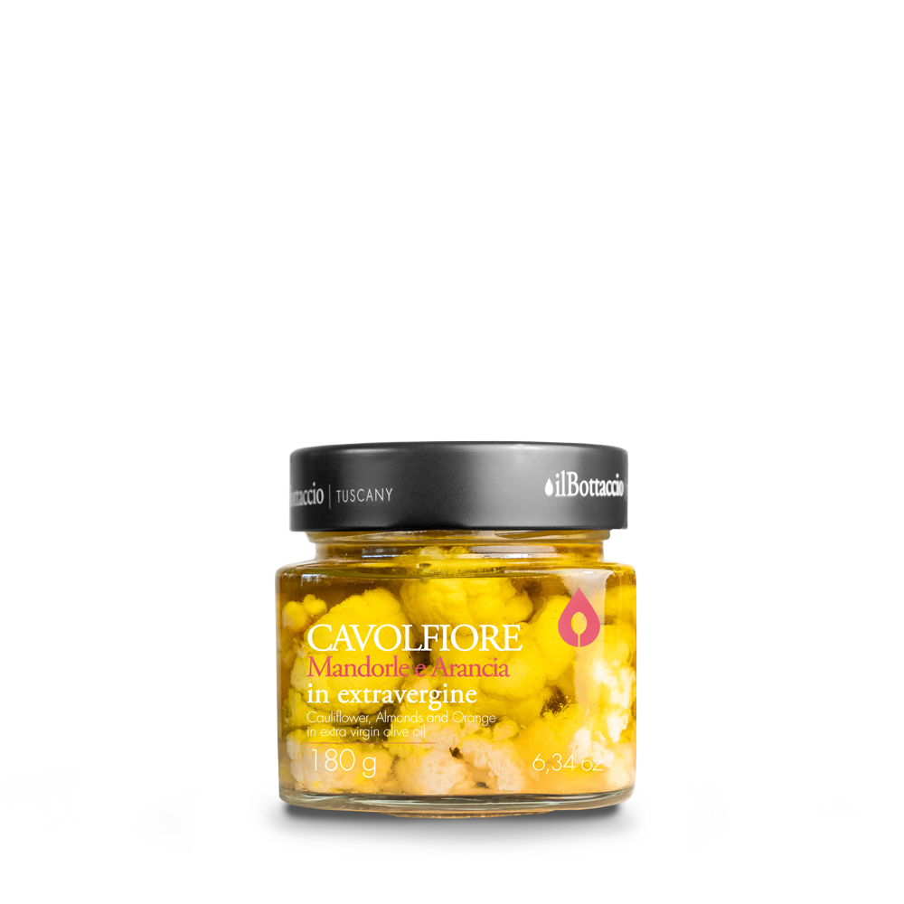 Description and pairing: Cauliflower, almond and orange in extra virgin olive oil. Delicious with smoked salmon, crispy speck or in a salad with rucola and grana.