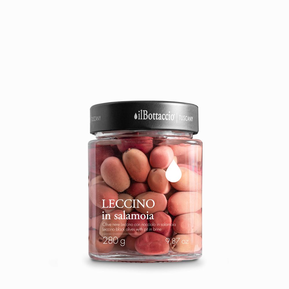Description and pairings: Leccino black olives in brine, ideal for cocktails, as ingredients for appetizers, salads, pizzas or to enrich meat or fish fillets; also excellent as an aperitif.